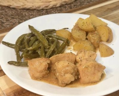 Place chicken, potatoes, and green beans in the cooker. Top with butater, soup mix and seasonings. Cook on high for 4 hours or low for 8 hours.